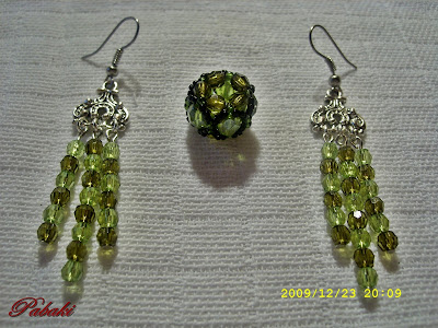 Zöld csiszolt gyöngyökből készült lógós fülbevaló, hozzá medálként a gyöngybogyó - Arduinna.