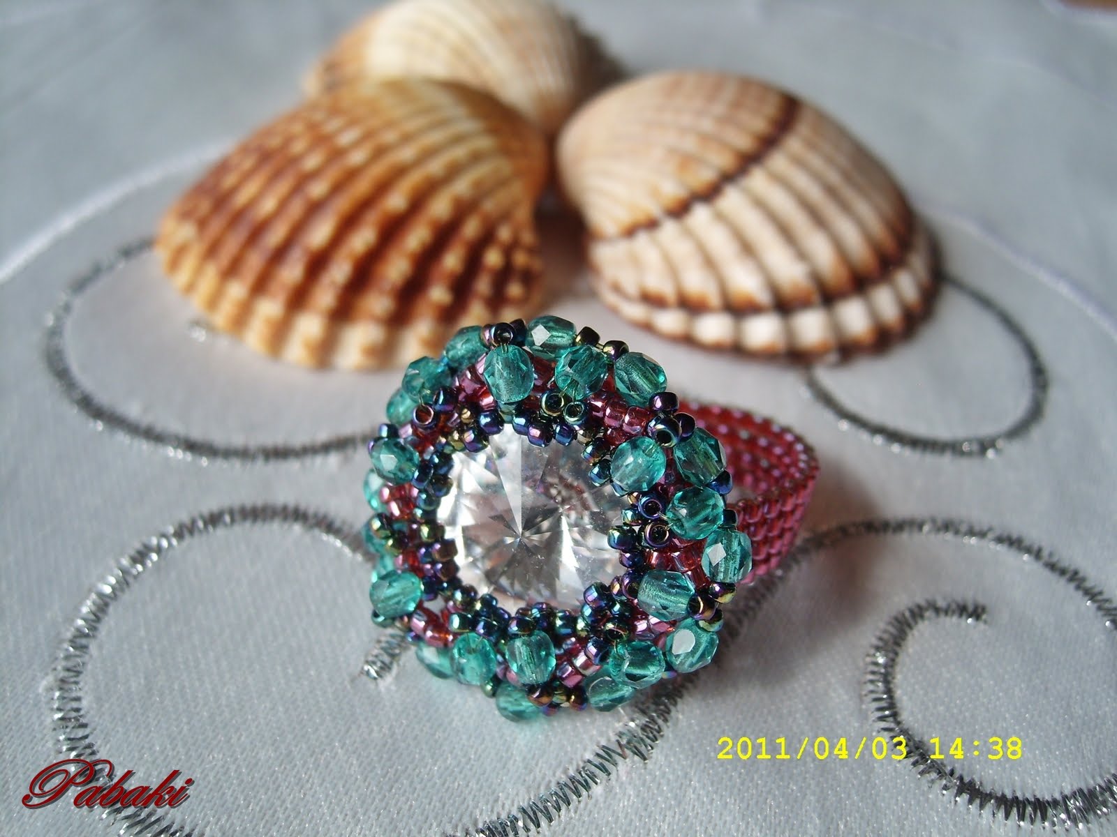 Hana gyűrű, picit kisebb kivitelben, mert csak 14-es rivolim volt itthon. Viszont a hátoldalát is "begyöngyöztem", hogy ne kopjon le a Swarovski közepe.