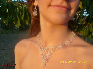 Egy ünnepi szettet készítettem Keresztanyukám 60. születésnapjára. Fényképezni elég nehéz volt, de a napfényben azért jól mutat Dóri lányomon. :-)