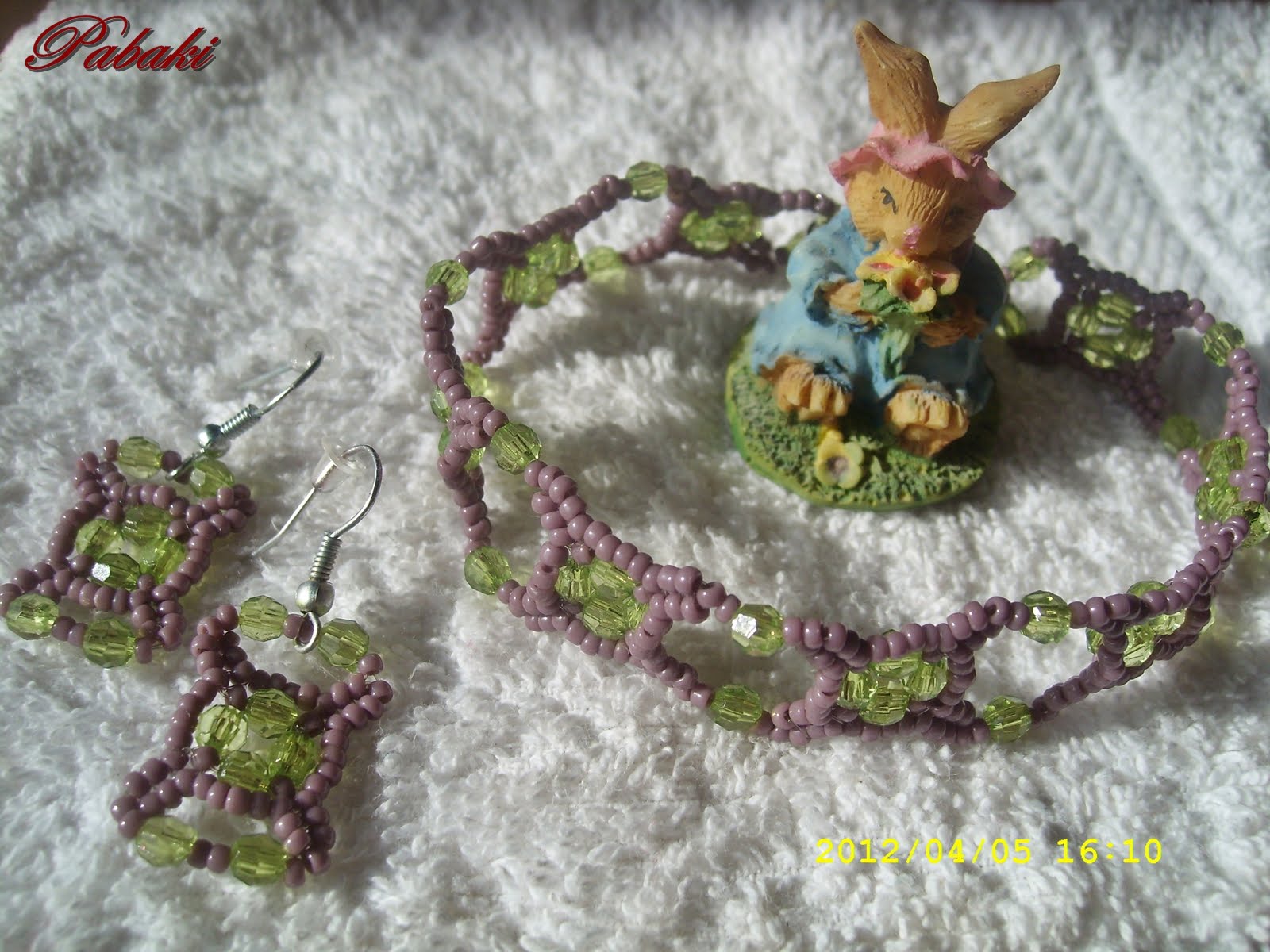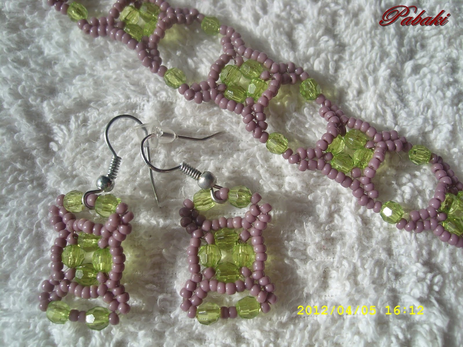 Filae karkötő, hozzá fülbevaló. Tavaszias lila-zöld színkombinációban.